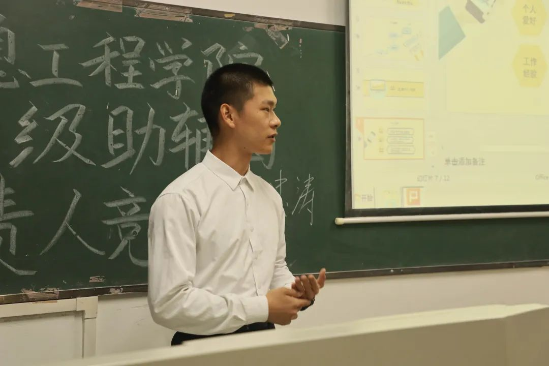 在教学楼2501下午15:00召开此次面试现场,竞选开始!首先我们看到的是实习助辅带着他们的ppt快步走上讲台,脸颊上挂着自信的笑容,坚定的眼神仿佛闪烁着光芒,由此可见他们的准备是相当充分,然后把他们精心制作的ppt展现出来,用着铿锵有力的声音介绍者着自己,向着他们最理想的岗位卬头阔步。接着用最自信的态度表达出他们对未来工作的规划,以及岗位的认知,最后以完胜者的姿态致谢收尾。严肃的态度然后让我们感受到了实习助辅的郑重其事。就来看看他们的精彩表现吧。
