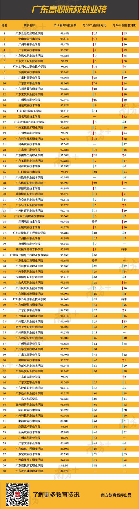 南方教育智库统计显示,广东食品药品职业学院为98.68%、中山职业技术学院为98.61%、广州华夏职业学院为98.47%、广东职业技术学院为98.39%、广东机电职业技术学院为98.32%、广东女子职业技术学院为98.3%、广东水利电力职业技术学院为98.3%、东莞职业技术学院为98.24%、广东科贸职业学院为98.16%、广东青年职业学院为98.06%,位列前10名。